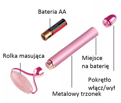 Wałek do masażu i liftingu twarzy wykonany z różowego kwarcu nazywanego w Azji kamieniem miłości, z dodatkową funkcją wibracji. Złoty.