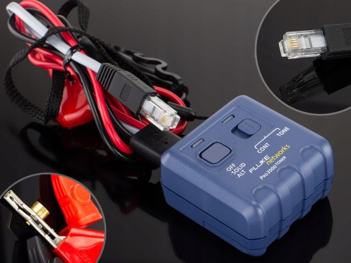 - Lokalizacja pojedynczych i wieloparowych kabli miedzianych. Wyposażony jest w złącze RJ11 i parę złącz (2) typu krokodylek. Kable na stałe przymocowane do generatora tonowego;
