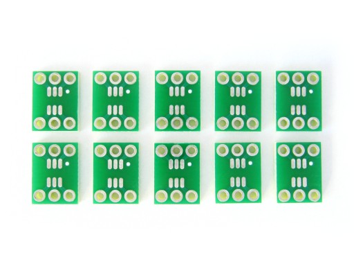 Zestaw 10 szt. płytek PCB adaptera SOT23-6 (SOT26, SC59-6, SC74, TSOP-6, MO-178AB, SMT6, SM6, Mini6, SOT457) na DIP6 (bez złączy). Laminat FR4 o grubości 1,6 mm. Wszystkie krawędzie szlifowane. Do zastosowania na płytkach stykowych (przykład na fotografiach poniżej).