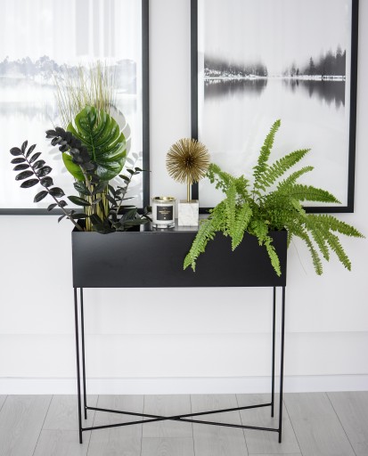Nowoczesna, metalowa donica - stojak na kwiaty, który może też pełnić funkcję konsoli do przechowywania gazet/książek, czy przedmiotów dekoracyjnych.