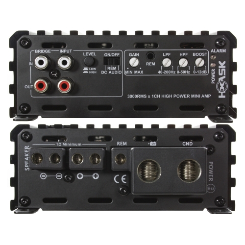 1-kanałowy wzmacniacz samochodowy o mocy 1x1000/2000/3000W, stabilny do 0,5Ω , cyfrowy (D), możliwość mostkowania (Bridge-Link), wejścia sygnału Hi/Lo, Auto Turn On/Off, niewielkie wymiary