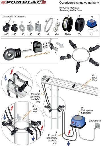 Prezentujemy Państwu kompletny zestaw ogrodzenia elektrycznego przeciw kunom, który skutecznie pozwala zabezpieczyć poddasze gospodarstw domowych jak i budynków użyteczności publicznej. Bariera elektryczna do montażu na rynnach i rurach odprowadzających przeciw kunom w domach. Urządzenie zabezpiecza budynek przed wspinaniem się kun na dach. Kuna domowa jest w stanie przecisnąć się niemal przez każdy otwór. Szuka schronienia w ciepłych i suchych miejscach jakimi są np. podbitki na poddaszu wypełnionych włóknem szklanym lub w ścianach pomiędzy murem a płytami kartonowo - gipsowymi. Gdy zwykłe środki zawodzą należy zamontować ochronę zewnętrzną, do której idealnie nadaje się prezentowany system odgrodzenia elektrycznego na rynny. Po wejściu kuny na rynnę spotyka się z barierą elektryczną w postaci impulsu elektrycznego o maksymalnej energii impulsu 2,4 J. Szkodnik po kontakcie z odgrodzeniem rynnowym nabiera respektu przed próbą kolejnego wejścia, a najczęściej całkowicie rezygnuje z kolejnej próby.