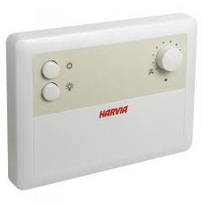 Najprostsze sterowniki manualne do elektrycznych pieców do sauny Harvia o mocy 3 - 9 kW. Regulacja czasem pracy pieca i temperaturą w kabinie odbywa się widocznymi na zdjęciu pokrętłami.