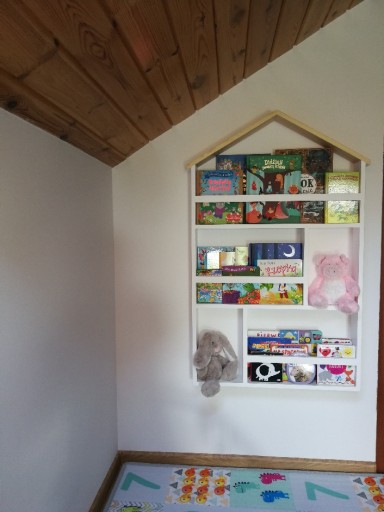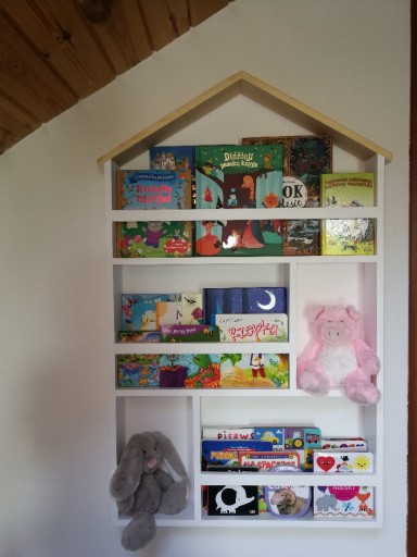 NA SPRZEDAŻ MAM WISZĄCĄ PÓŁKĘ NA KSIĄŻKI W KSZTAŁCIE DOMKU. PÓŁKA POSIADA MIEJSCE NA ZABAWKI. ZOSTAŁA WYKONANA RĘCZNIE Z LITEGO DREWNA SOSNOWEGO I POMALOWANA FARBĄ EKOLOGICZNĄ. MOZLIWOSC DOROBIENIA PŁYTY TYLNEJ KOSZT TO 50 ZŁ. POSIADA LISTWĘ MONTAŻOWĄ Z OTWORAMI O ŚREDNICY 8 MM NALEŻY KUPIĆ KÓŁKI ROZPOROWE ODPOWIEDNIE DO ŚCIANY NA KTÓREJ BĘDZIE ZAMONTOWANA PÓŁKA