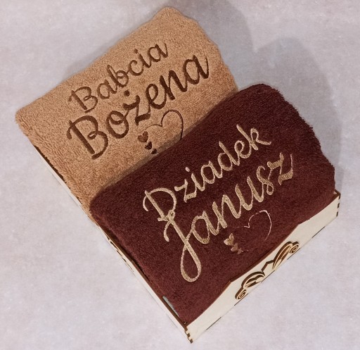 Przedmiotem oferty jest zestaw dwóch bawełnianych ręczników w rozmiarze 100x50 cm, zapakowanych w ozdobną drewnianą skrzyneczkę + dowolny haft GRATIS.