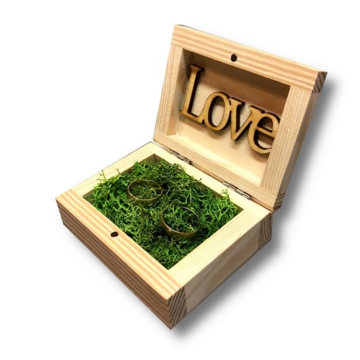 Pudełko na obrączki w zestawie ze sztucznym mchem oraz napisami ze sklejki 3d.
