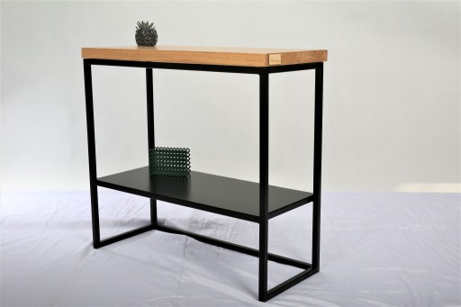 Przedmiotem sprzedaży jest metalowa konsola z drewnianym blatem oraz metalową półką.