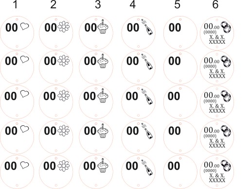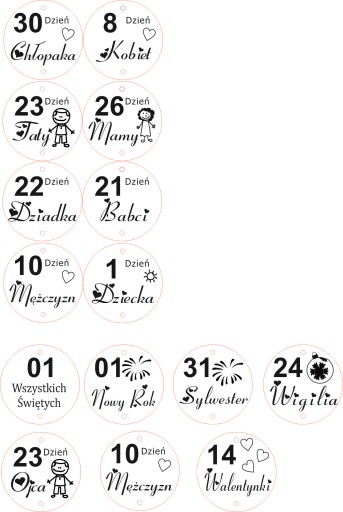 * 10 x kółka drewniane, średnicy 25mm ( UWAGA kółka są bez graweru, do własnoręcznego zapisania imion i dat) (możliwość dokupienia graweru na innych aukcjach)