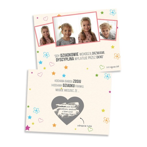 Spersonalizowana kartka ZDRAPKA dla babci i/lub dziadka to oryginalny pomysł na upominek z okazji ich święta lub dodatek do przygotowanego większego prezentu! Na kartce zostaną umieszczone przesłane przez Ciebie zdjęcia, a pod zdrapką ukryty dowolny tekst - może być to wierszyk, sentencja lub życzenia płynące prosto z serca wnuków.
