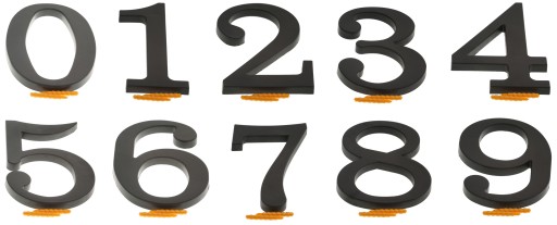 Cyfry przygotowane do powieszenia na elewacji budynku lub innej płaskiej powierzchni przy użyciu załączonych kołków montażowych lub silikonu. Cyfry wykonano z wysokiej jakości tworzywa odpornego na zmienne warunki atmosferyczne.