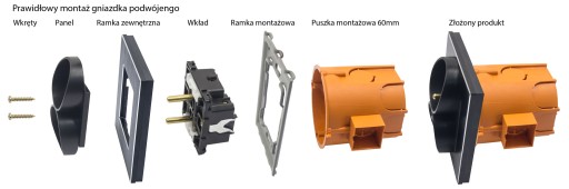 - Gniazdo pasuje do puszki o średnicy 60mm (zestaw nie posiada puszki montażowej)