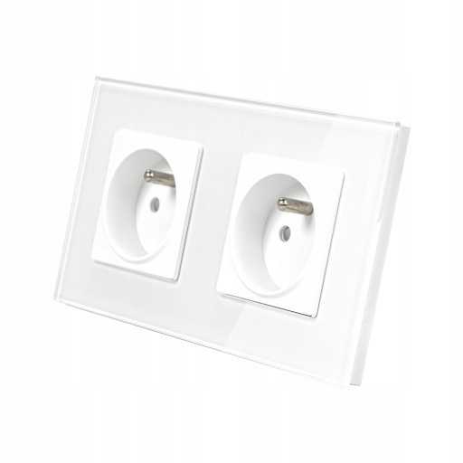 Podwójna ramka szklana biała w zestawie z dwoma gniazdami elektrycznymi z bolcem, komplet gotowy do montażu.