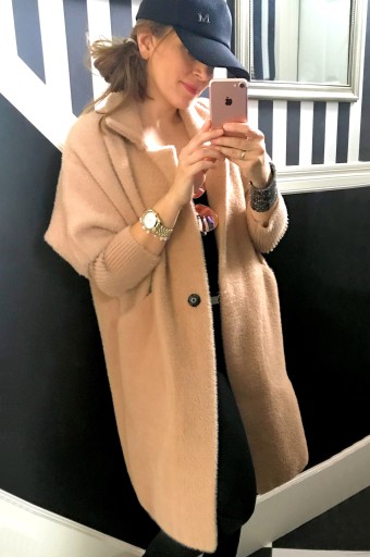 - Płaszcz ALPAKA zapinany jest na duży nap na wysokości pasa;