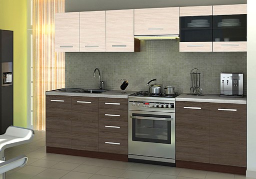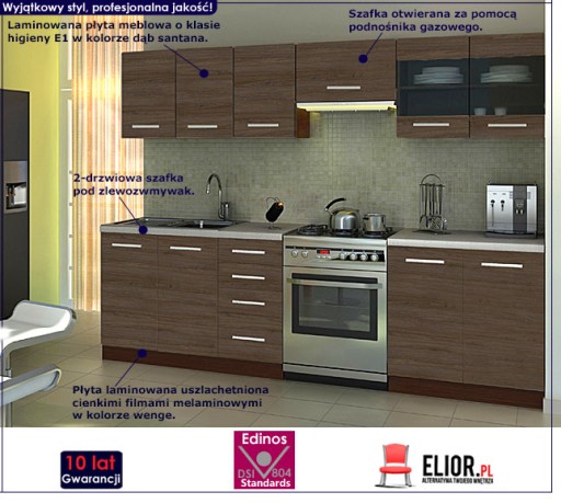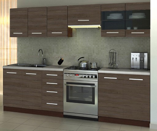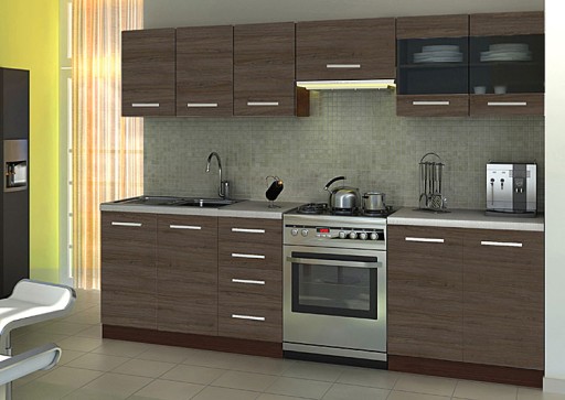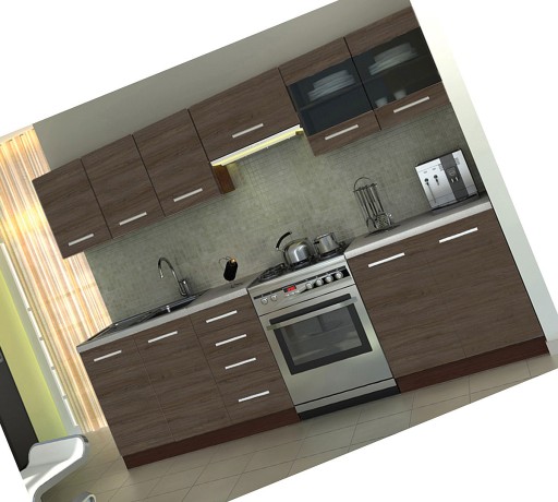 - Wymiary: długość zestawu: 260 cm, grubość blatu: 28 mm, wysokość szafek górnych: 57 cm, głębokość szafek górnych: 31 cm, wysokość szafek dolnych: 85 cm, głębokość szafek dolnych: 60 cm.