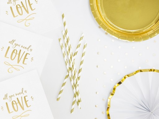 Serwetki papierowe w kolorze białym, ze złotym metalizowanym napisem All you need is love.
