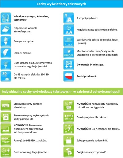 Wyświetlacze wyposażone są w EFEKTY prezentowania tekstu oraz LICZNE USTAWIENIA, m.in. regulację jasności oraz prędkości i czasu zatrzymania efektu.