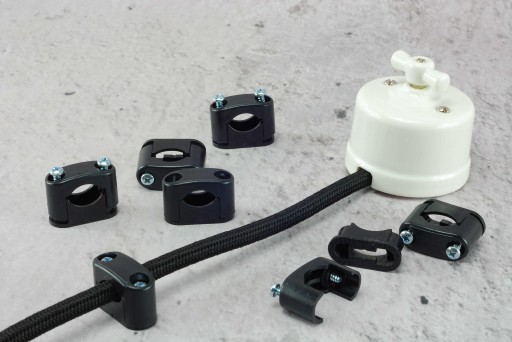 Uchwyty montuje się bardzo prosto, składają się z dwóch elementów: korpusu, który przykręcamy do ściany, sufitu lub gdziekolwiek oraz nakładki dociskającej. Przykręcamy korpus za pomocą kołka znajdującego się w zestawie, kładziemy przewód i skręcamy nakładkę.