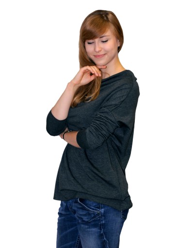 Rękaw długi, tył lekko przedłużony, luźny dekolt.