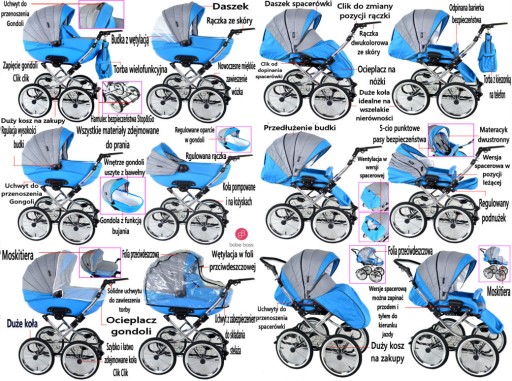 - Możliwość wyboru koloru gondoli w każdym wózku