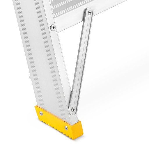- Aluminiowe burty boczne zabezpieczające przed możliwością postawienia stopy poza platformą bądź przed spadkiem narzędzi z platformy
