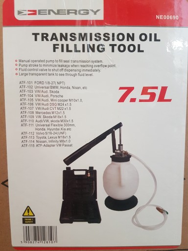Zestaw łączy nowy typ dozownika z popularnymi adapterami do skrzyń automatycznych biegów z zamkniętym obiegiem. Dozownik umożliwia operatorowi wypełnienie lub wymianę do 7,5 litrów płynu pod ciśnieniem co uwalnia operatora od potrzeby ciągłego pompowania ręcznego. Pompa służy do opróżniania i napełniania olejem skrzyni biegów oraz mechanizmów różnicowych. Adaptery mają szybki system wtykowy łącznik.