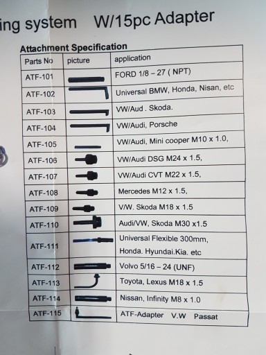 Adaptery przeznaczone do napełniania lub uzupełniania większości producentów przekładni automatycznych, gdy poziom płynu jest niski lub po zmianie filtru.