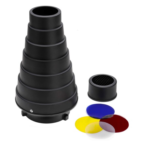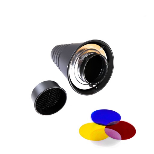 W komplecie ze strumienicą występuje grid (plaster miodu), który dodatkowo zwiększa kontrast oraz kierunek świecenia, a także cztery kolorowe filtry.