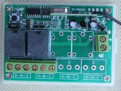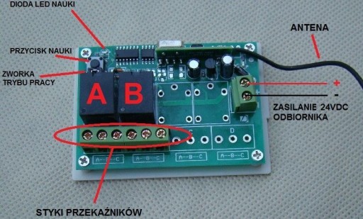 Odbiornik wielkosci 7,5x5,5cm i grubosci 2,5cm. Zasilanie przez 24VDC (+ -2V) wg schematu. Kazdy kanał posiada przekaźnik z wyprowadzonymi 3 pinami: wspólny COM (oznaczony jako B) , NO (A) oraz NC (C).