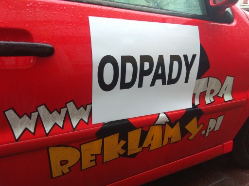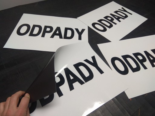 Przedmiotem sprzedaży jest naklejka magnetyczna koloru białego 0,75mm grubości, w rozmiarze 400x300 mm z czarnym napisem ODPADY