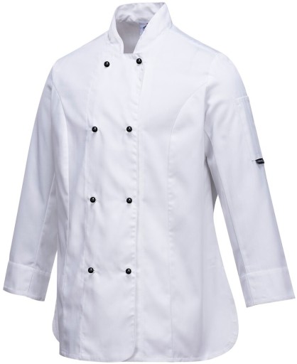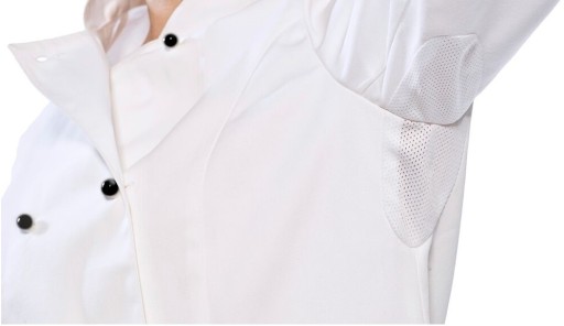 Robocza koszula kucharska przeznaczona do pracy w lokalach gastronomicznych. Dla zachowania świeżości podczas pracy, zaprojektowano oczka wentylacyjne oraz panele z siatki MeshAir™ umieszczone pod pachami. Koszula posiada rozcięte mankiety oraz cztery rzędy wypinanych guzików w czarnym kolorze. Na rękawie znajduje się dodatkowa kieszonka. Odzież wykonana z bardzo trwałej tkaniny o skośnym splocie odpornym na odbarwienia. Tkanina została wykurczona co gwarantuje zachowanie rozmiaru po wielu praniach.
