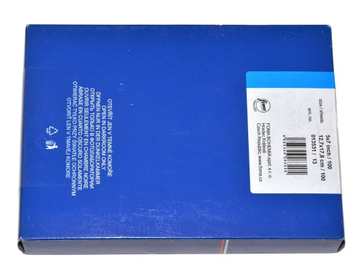 Opis towaru: Amatorski papier stałogradacyjny czeskiej firmy Foma. Produkowany w czterech gradacjach: miękkiej S, specjalnej Sp, normalnej N i kontrastowej C. Z gradacją miękką są ostatnio duże problemy u producenta... Oznaczony kolejno paskami koloru: zielonego, żółtego, czerwonego i niebieskiego. Powierzchnia: półmat 313, mat 312, błysk 311. Gradacje papieru są lekko zawyżone jeśli by je porównać do polskich papierów Fotonbrom. Obrabia się je w każdym wywoływaczu, przerywaczu czy utrwalaczu dostępnym na rynku. Podłoże plastikowe PE - nie wymaga długiego płukania oraz suszenia na gorąco. Odbitki należy płukać krótko i suszyć na wolnym powietrzu na leżąco lub w stanie wiszącym. Podłoże przy suszeniu musi przepuszczać powietrze np. materiał, tkanina, odbitki suszone na blacie stołu lub szkle nie wysuszą się od spodu ! Gradację papieru dostosowuje się do gradacji negatywu na zasadzie przeciwieństwa. Kontrastowy negatyw wymaga papieru miękkiego, negatyw miękki - papieru kontrastowego, a normalny - papieru normalnego. Opakowanie 100 arkuszy papieru kontrastowego, błysk C311 w formacie 13x18 cm.