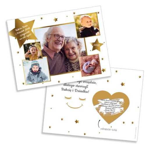 Spersonalizowana kartka ZDRAPKA dla babci i/lub dziadka to oryginalny pomysł na upominek z okazji ich święta lub dodatek do przygotowanego większego prezentu! Na kartce zostaną umieszczone przesłane przez Ciebie zdjęcia, a pod zdrapką ukryty dowolny tekst - może być to wierszyk, sentencja lub życzenia płynące prosto z serca wnuków.