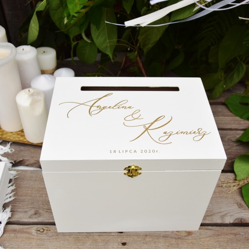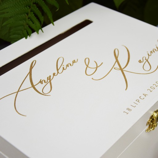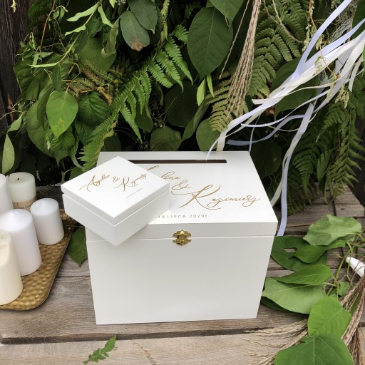 Kuferek na koperty to nieodłączny element każdego wesela. Szczególną wartość ma jednak ta, która jest przypisana danej parze, ma subtelny nadruk i napis. Dzięki swojej pojemności w przyszłości znajdzie praktyczne zastosowanie przy przechowywaniu pamiątek rodzinnych