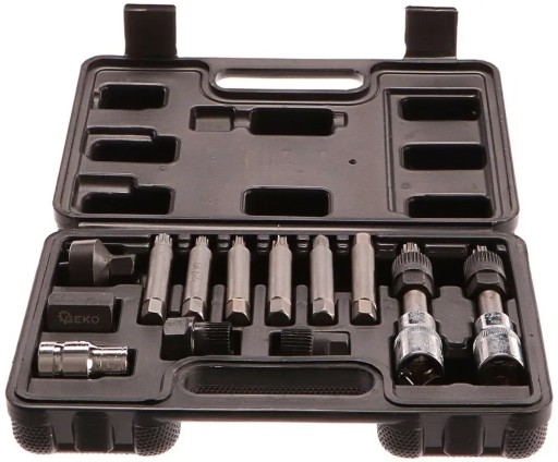 Zestaw kluczy do montażu i demontażu alternatorów. Klucze wykonane zostały z wysokogatunkowej stali chromowo-wanadowej CrV, dzięki czemu są wytrzymałe i odporne na uszkodzenia. Klucze umożliwiają jednoczesne odkręcanie śruby mocującej koło pasowe (za pomocą odpowiedniego bitu) oraz przytrzymywanie koła ze sprzęgłem (za pomocą specjalistycznej nasadki).