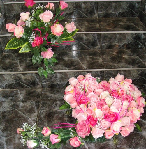 Na tej aukcji oferujemy Państwu bardzo ciekawy, nietuzinkowy komplet - stroik na grób albo do dekoracji wykonany w kształcie serca w kolorystyce jak na zdjęciach (odcienie różu) + bukiet w wkładzie do wazonów (wystarczy włożyć do posiadanego wazonu).