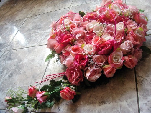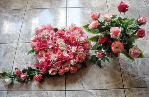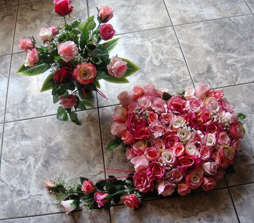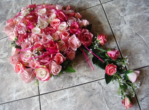 Do wykonania oferowanej kompozycji użyto wysokiej jakości ok.60 szt kwiatów sztucznych róż, zielonych gałązek, gipsówki innych dodatków florystycznych. Użyte materiały są bardzo dobrej jakości, odporne na warunki atmosferyczne. Serce wykonane jest na styropianie przyklejonym do wodoodpornej sklejki. Od spodu jest zamocowana podpórka która może służyć również za "rączkę" do trzymania serca.