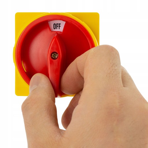 Obudowa wykonana z tworzywa sztucznego, pokrętło w kolorze żółto-czerwonym. Możliwość założenia kłódki w pozycji "0".