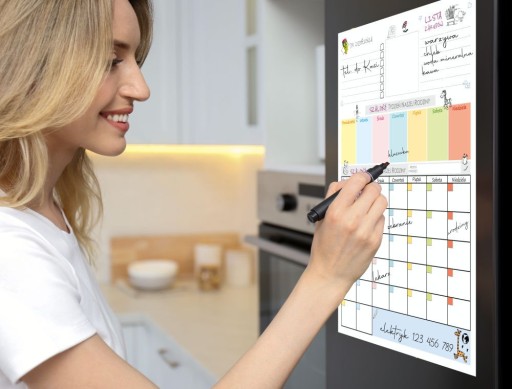 Duży planer magnetyczny na lodówkę z czarnym pisakiem.