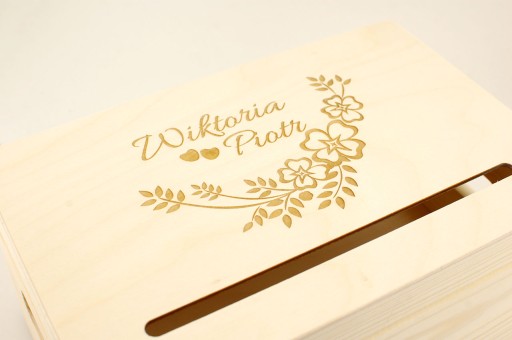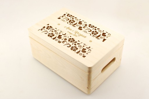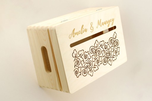 Pudełko na koperty – życzenia ślubne, drewniane, otwierane. Posiada dwa boczne uchwyty oraz otwierane wieczko z otworem do wrzucania kopert, ozdobione wygrawerowanymi imionami Młodych, datą ślubu lub dowolnym tekstem oraz dekoracyjnym motywem. Takie pudełko to praktyczny i ładny dodatek do oprawy Waszego ślubu, które później może posłużyć jako pudło pamiątek weselnych lub na inne drobiazgi.