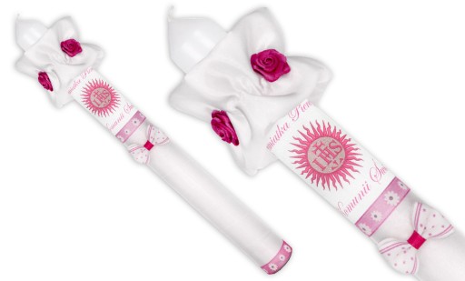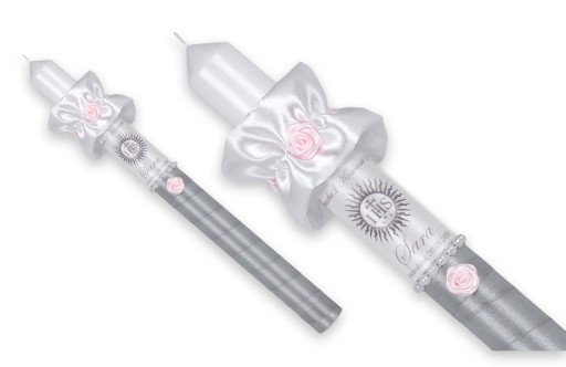 to świeca stylizowana pierścieniem z perełek oraz białą satyną, zdobiona różyczką. Dedykowana zarówno dla chłopców jak i dziewczynek.