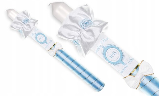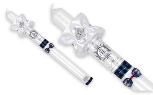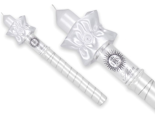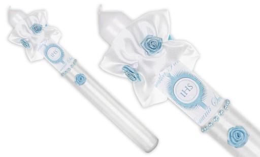 to świeca stylizowana srebrną satyną oraz perełkami. Maryjny kolor aplikacji sprawia, że świeca dedykowana jest chłopcom, jednak w niektórych regionach Polski również dziewczynkom
