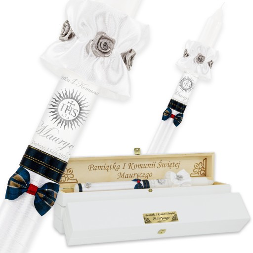 ŚWIECA KOMUNIJNA ŚWICA KOMUNIA + DREWNIANE PUDEŁKO ŚWIECY BIAŁE IMIĘ GRAWER