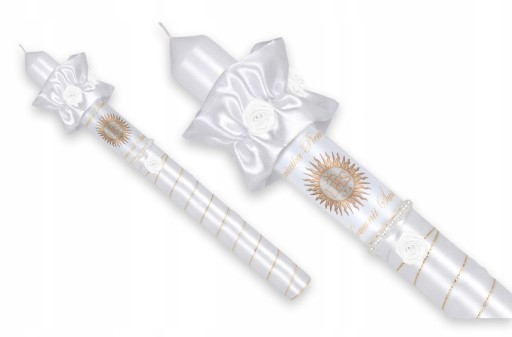to świeca stylizowana pierścieniem z perełek oraz białą satyną ze złotym akcentem. Dedykowana zarówno dla chłopców jak i dziewczynek.