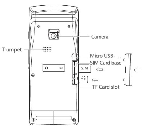 Przenośny terminal AP02 posiada zestaw bezprzewodowych interfejsów komunikacyjnych. Jest wyposażony w duży czytelny wyświetlacz w technologii IPS oraz pojemnościowy ekran dotykowy. Terminal ma trzy wydzielone przyciski do regulacji głośności i włączania zasilania. Wbudowana pamięć ma dużą pojemność, którą można powiększyć instalując kartę pamięci typu TF. Instalacja kart pamięci i SIM jest bardzo łatwa, co ilustruje rysunek.