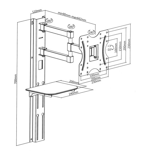 - Regulowana odległości od ściany: 90 do 442 mm