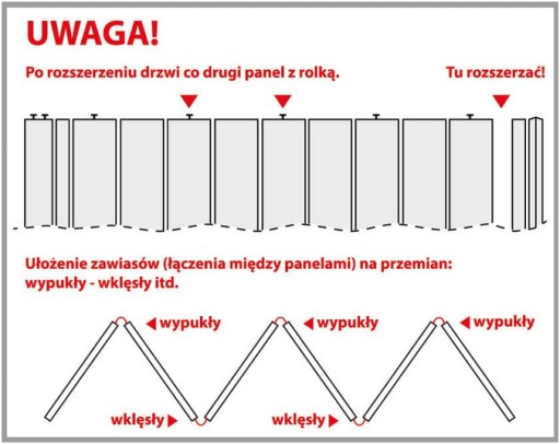 * Podczas montażu dodatkowych paneli należy zwrócić uwagę żeby panel z zawiasem był tak zamontowany aby zawiasy (silikonowy lub rurkowy pcv - w zależności od modelu drzwi) były na przemian (wypukły, wklęsły itd). Istnieje możliwość wymiany samego zawiasu bez konieczności demontażu panela, wystarczy odkręcić tylko śrubki przy zawiasach.