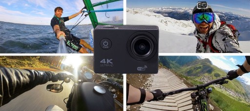 Kamera Sportowa rejestrująca obraz w jakości 4k ultra HD. W zestawie zawiera uchwyty i podstawki umożliwiające nagrywanie w każdych warunkach, nawet pod powierzchnią wody. Wodoodporna do 30m pod wodą i działająca na wysokość n.p.m.: 8 848 m