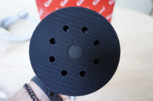 Dysk szlifierki posiada 8 otworów do odciągania pyłu, w układzie europejskim, pasującym do papierów dostępnych na naszym rynku.