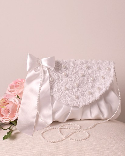 Torebka z aplikacją z różyczek, ozdobiona kilkunastoma perełkami i satynową kokardą.