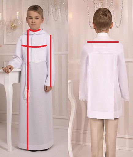 Kolor alby idealnie biały , prosimy nie sugerować się kolorem na zdjęciach.Na życzenie z wyhaftowaną hostią w kolorze złotym lub srebrnym.Dodajemy odpowiedni luz odzieżowy na obwodach.